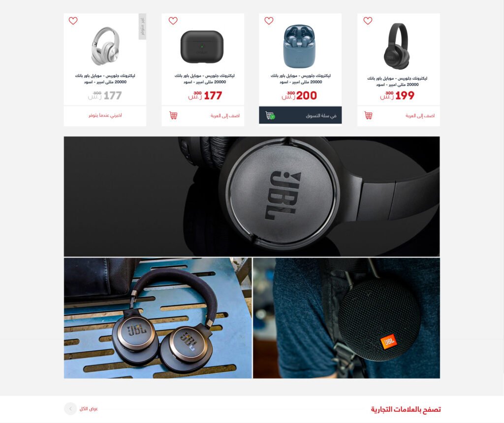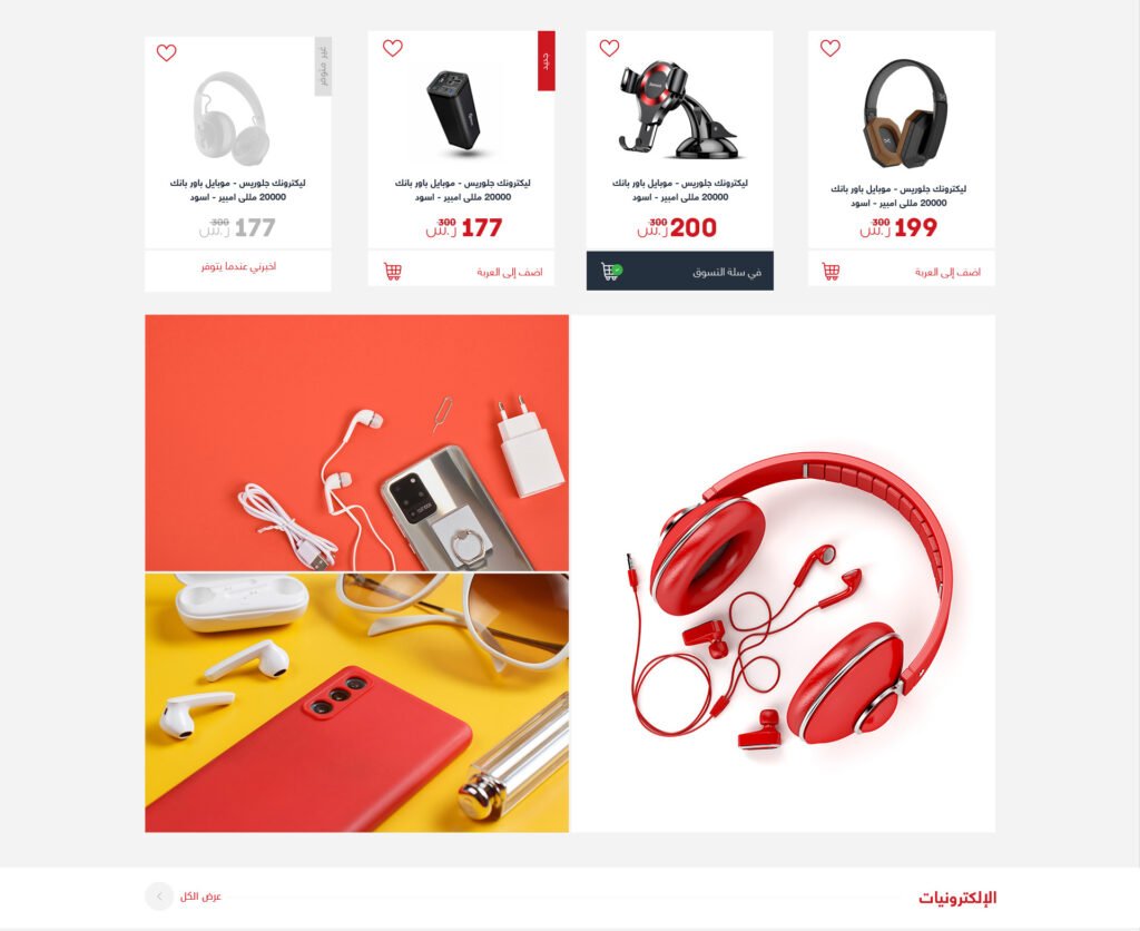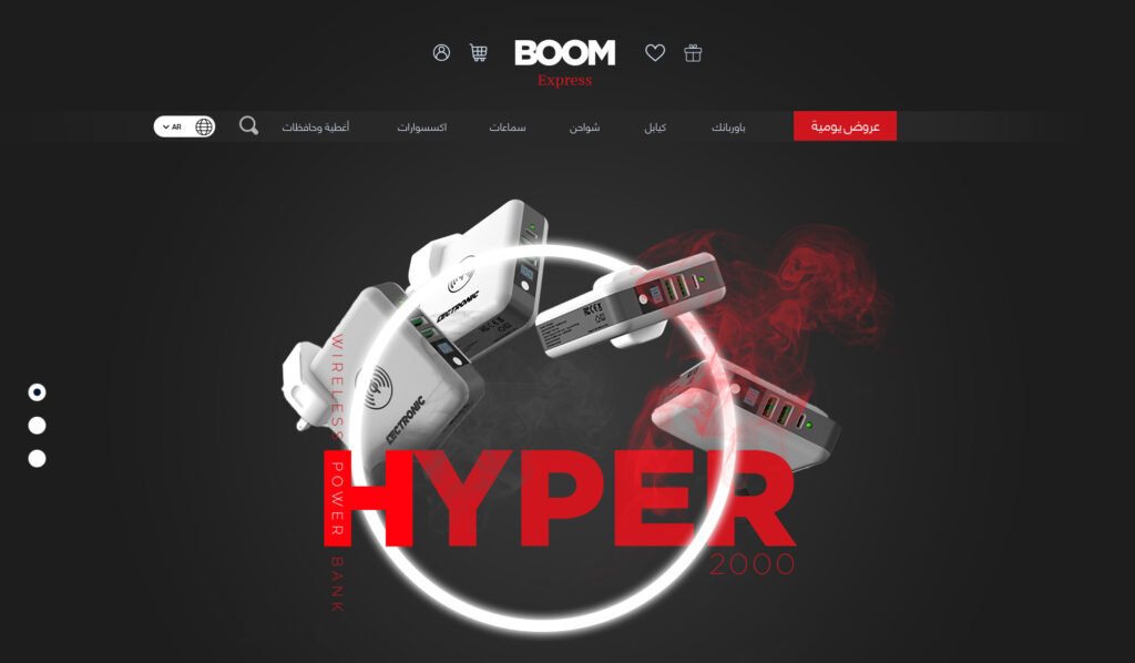 This is a custom-designed homepage for Boom Express, an Arabic e-commerce website specializing in electronics and accessories such as headphones, chargers, and power banks. The design combines a modern dark theme with bold product highlights and clear call-to-action buttons. The layout is fully responsive, showcasing product categories, best sellers, and branded sections in a clean and user-friendly interface.
