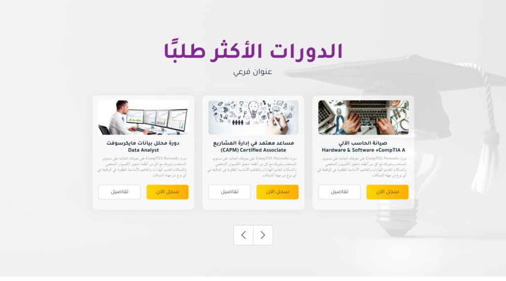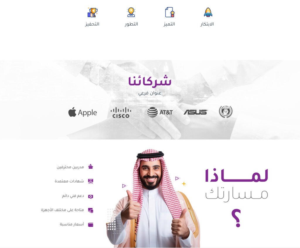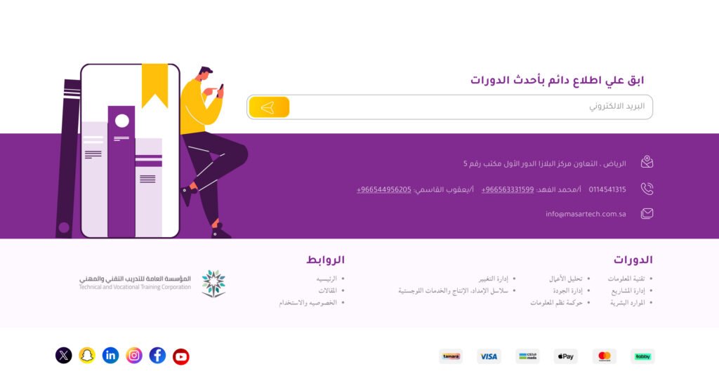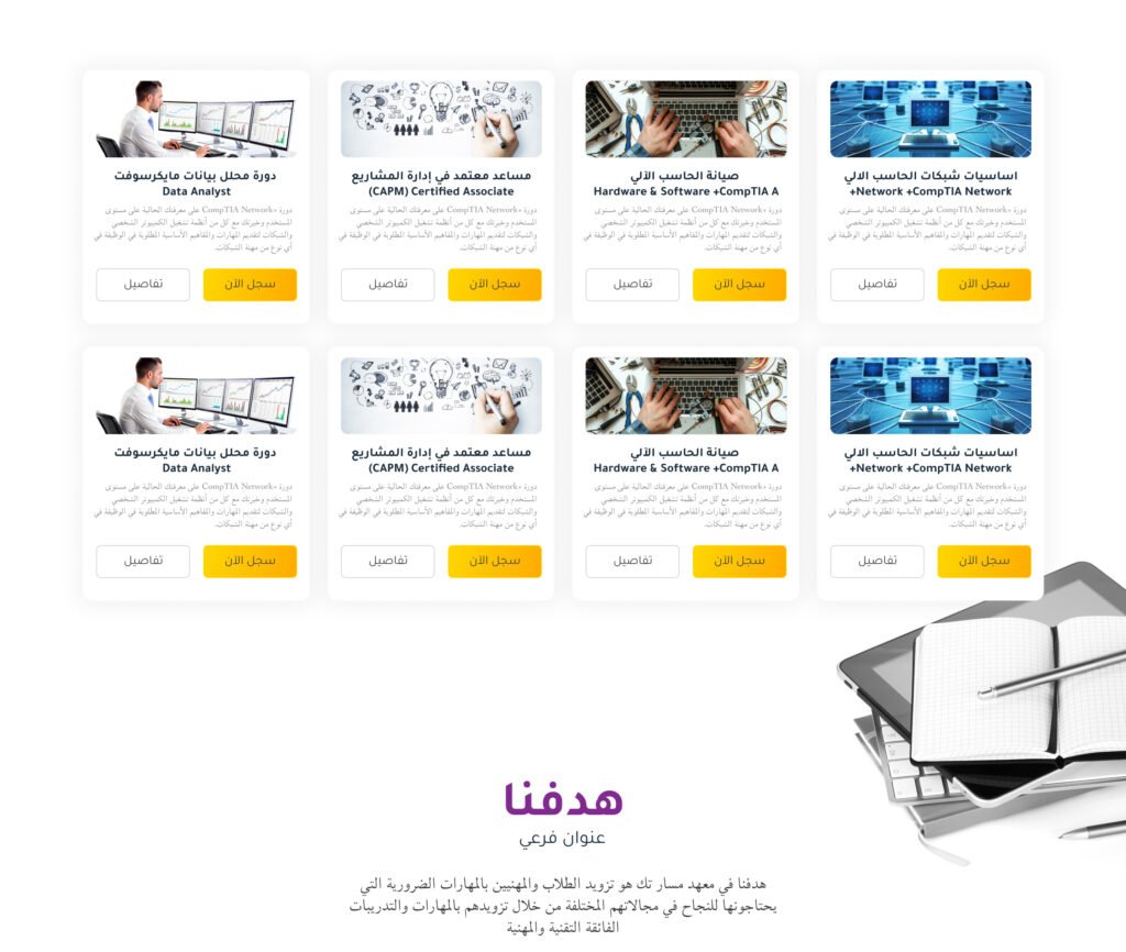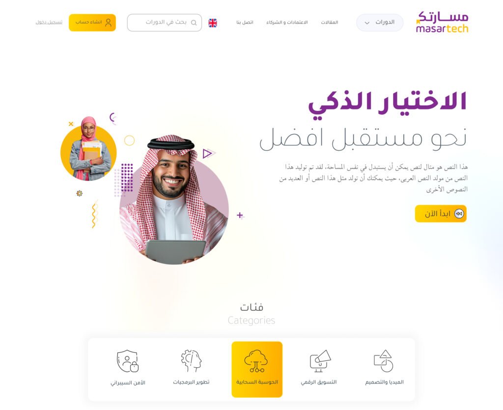 This is a homepage design for MasarTech, an Arabic e-learning platform offering online courses and certifications in technology and professional development.
